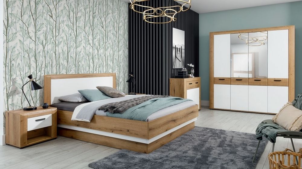 Tento ložnicový komplet se skládá z velké a prostorné čtyřdvéřové šatní skříně se zrcadly, dvou nočních stolků a postele 180cm. Cena postele je včetně výklopného roštu a velkého úložného prostoru, bez matrace. Matraci lze dokoupit v sekci matrace.