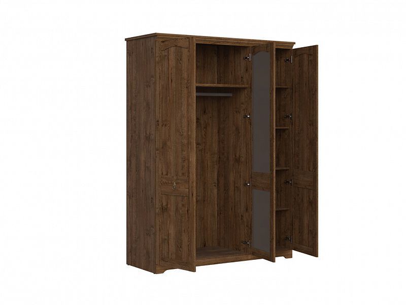 Skříň se zrcadlem - Jde o třídveřovou skříň, která má za dvířky šatní tyč a police. Skříň je kombinované, dvě třetiny jsou šatní a jedna třetina je policová Kovové úchyty zajišťují snadné otevírání dveří. Na prostředních dveřích je zrcadlo. Skříň je velmi prostorná a poskytne Vám velké množství tolik potřebného úložného prostoru.