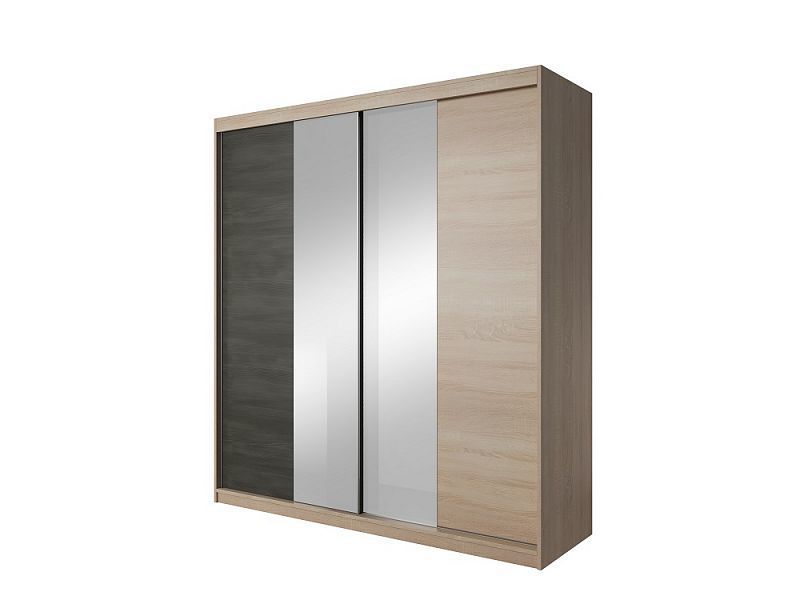 Skříň je kombinovaná, ve skříni jsou umístěny levá a pravá strana 4 x police, uprostřed nahoře 1x police a pod ní šatní tyč. Skříň má posuvné dveře se zrcadly, je velmi prostorná a poskytuje velké množství úložného prostoru.