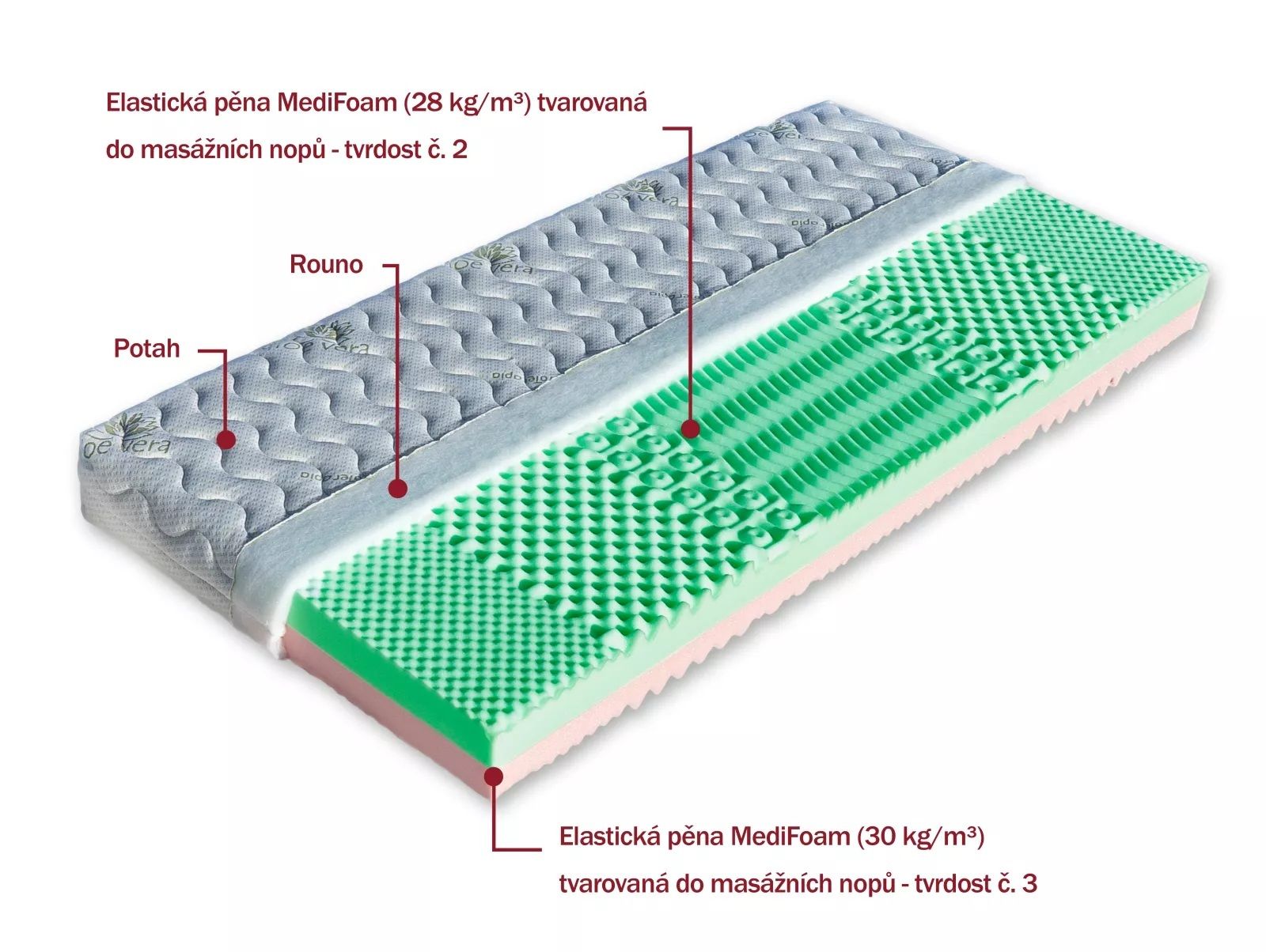 Sedmizónová kvalitní matrace s volbou dvojí tvrdosti je složena ze dvou vysoce kvalitních elastických pěn MediFoam (28 a 30 kg/m³) tvarovaných do masážních nopů. Nopy zabezpečují prokrvení pokožky a uvolnění svalů během spánku a nadzvedávají potah, čímž dochází k lepšímu provzdušnění matrace. Matrace se vyznačuje výbornou elasticitou a odolností. Je určena pro širokou škálu uživatelů a je vhodná na všechny typy roštů.