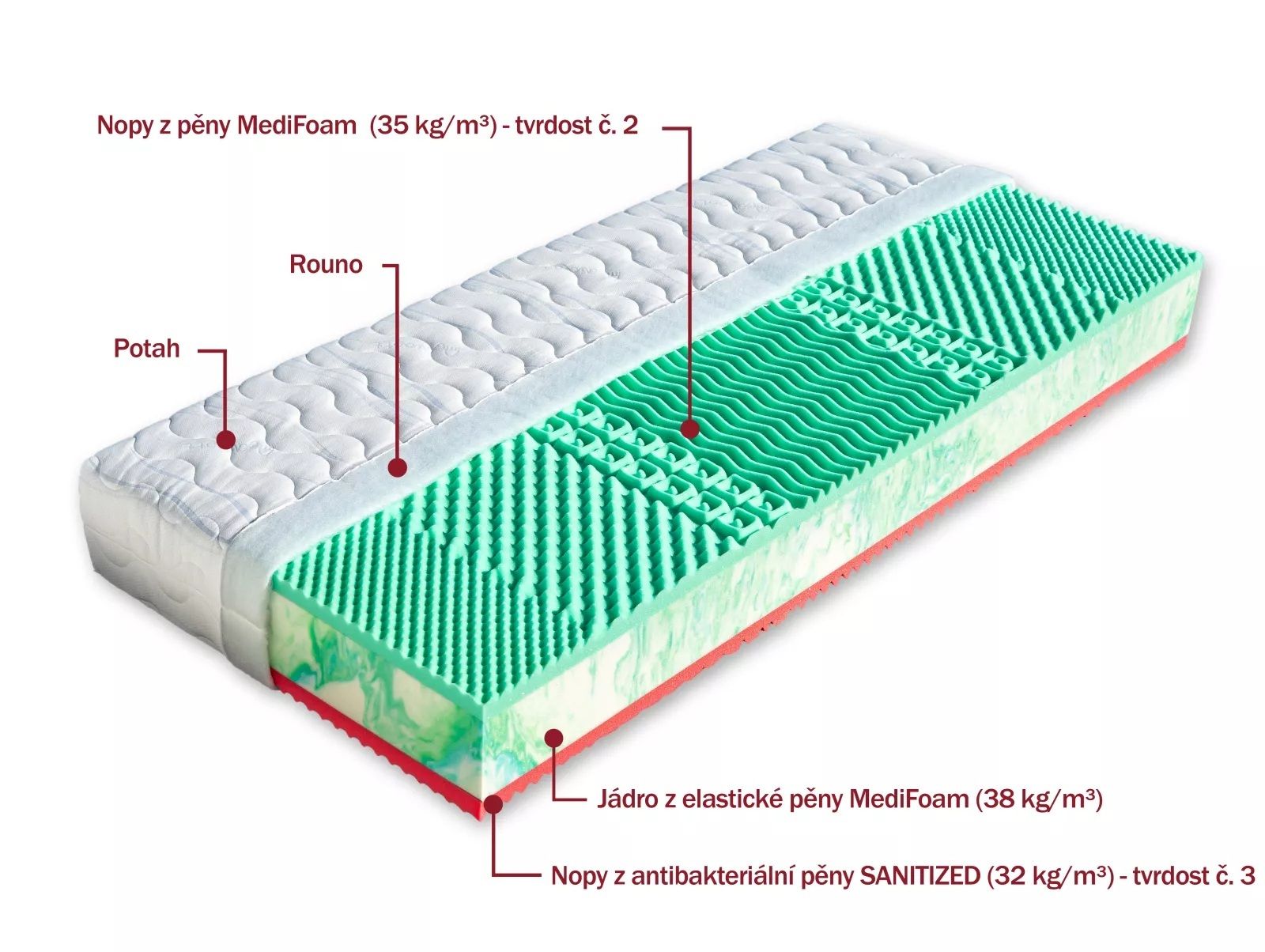 Vysoká kvalitní, sedmizónová matrace kde jádra těchto matrací jsou tvořena hráškově žíhanou pěnou MediFoam (38 kg/m³), která má skvělé podpůrné vlastnosti. Červená ložná plocha je tvořena antibakteriální pěnou tvarovanou do masážních nopů s úpravou Sanitized (32 kg/m³), tvrdost č. 3. Tyrkysově zelená pěna MediFoam (35 kg/m³) na druhé straně matrace je taktéž tvarovaná do nopů, tvrdost č. 2. Je vhodná pro všechny typy roštů. Ocení ji nejen alergici.