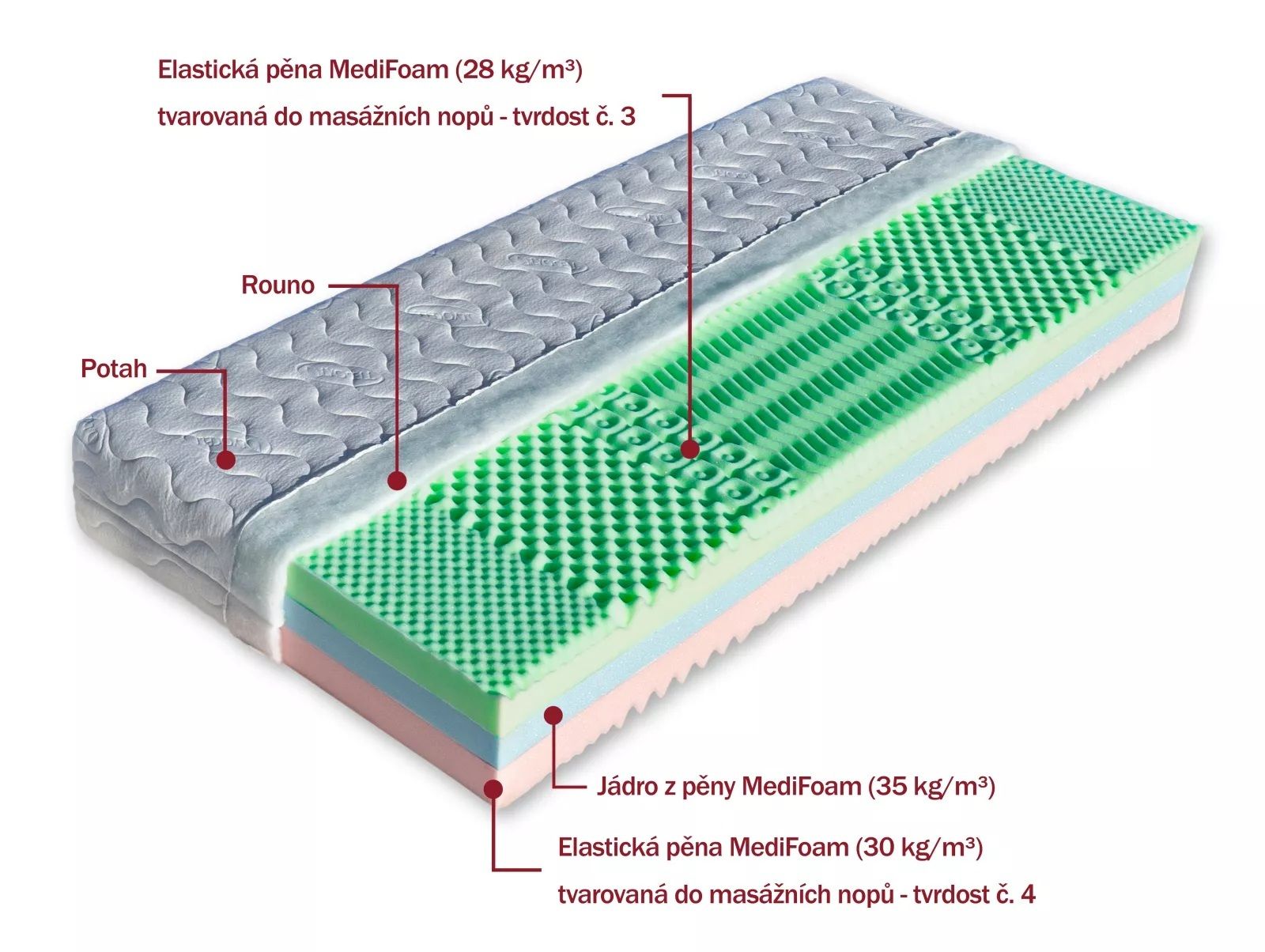 Sedmizónová matrace s volbou dvojí tuhosti. Střed jádra matrace je zpevněn vysoce gramážní pěnou MediFoam (35 kg/m³). Nosné vrstvy (28 a 30 kg/m³) jsou tvořeny kvalitními elastickými pěnami, které jsou tvarovány do masážních nopů. Nopy zabezpečují prokrvení pokožky a uvolnění svalů během spánku. Matrace je vhodná na všechny typy roštů.
