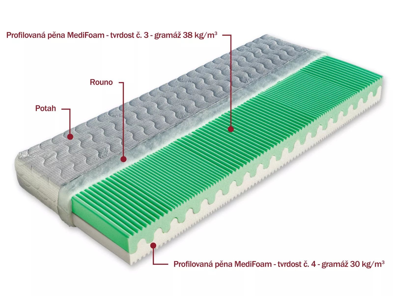Pětizónová matrace s volbou dvojí tvrdosti je složená ze dvou velmi kvalitních a elastických pěn MediFoam (38 a 30 kg/m³). Jemná masážní profilace na povrchu těchto pěn přispívá k většímu provzdušnění matrace. Pěny jsou spojeny vlnkovitým profilem bez použití lepidla. Je vhodná pro zákazníky, kteří upřednostňují tvrdší matrace. Matrace je vhodná na všechny typy roštů.