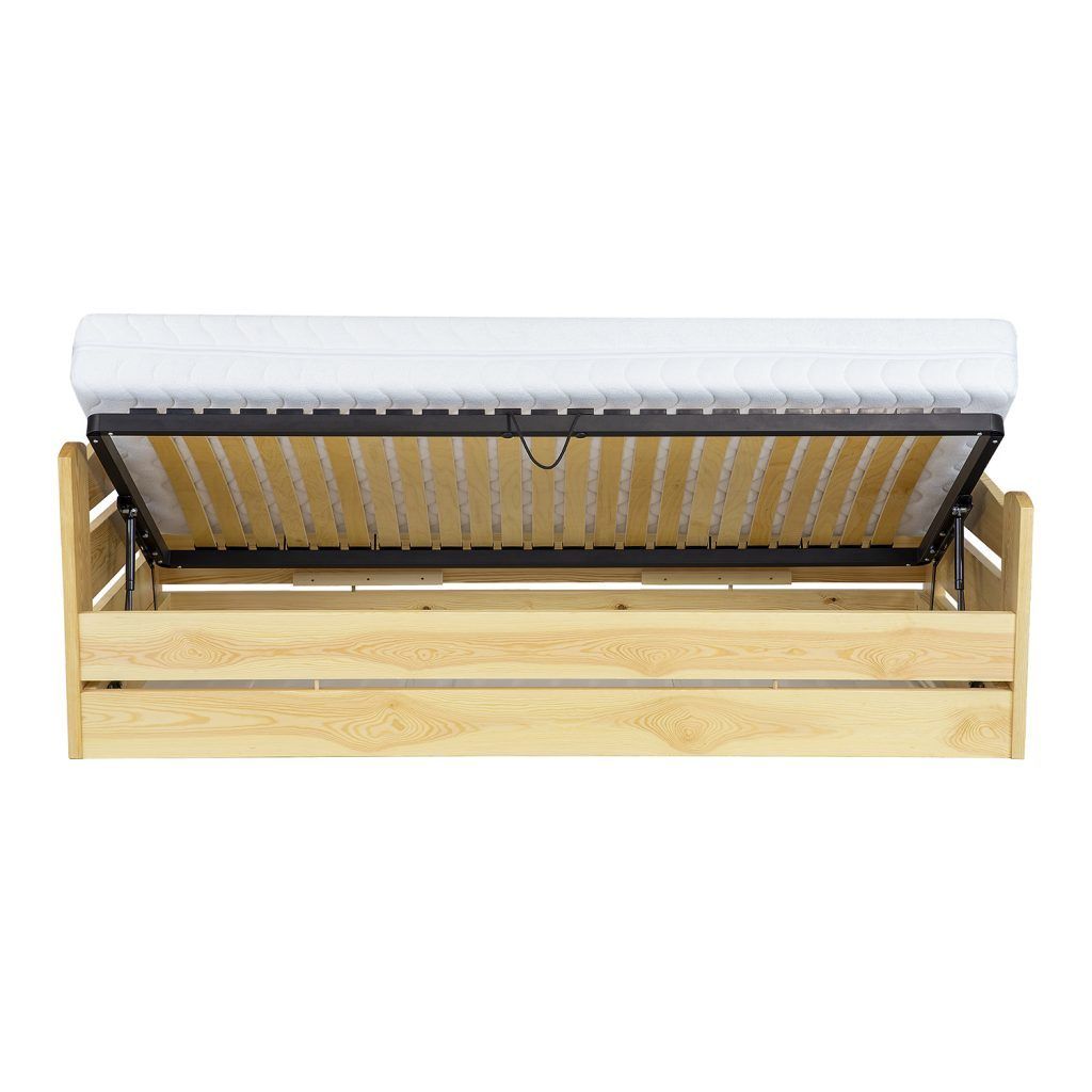 Kvalitní dřevěná postel z borovicového masivu s úložným prostorem, tl. dřeva je 2,5cm. Cena je včetně zvedacího kovového roštu na plynových pístech, které umožní snadné zvedání roštu.