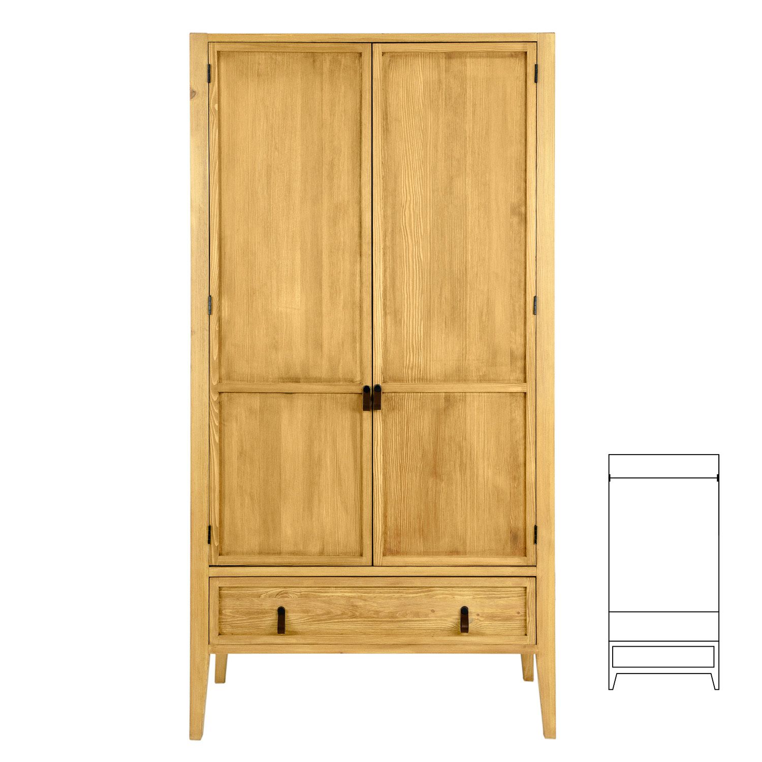 Skříň je dvoudvéřová, šatní se šuplíkem.