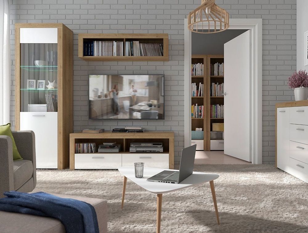 Moderní, kvalitní a vzdušná obývací stěna se skládá z vitríny, televizního stolku a police.