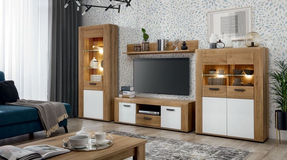 Moderní, luxusní a vzdušná obývací stěna se skládá z vitríny úzké, televizního stolku, police a vitríny široké. Do vitrín lze dokoupit působivé LED osvětlení za 490,-Kč do jedné vitríny, v případě zájmu napište prosím do poznámky.