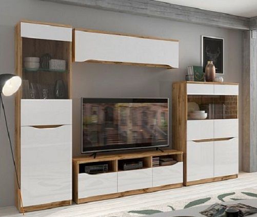 Moderní, vzdušná a praktická obývací stěna se skládá z vitríny úzké, televizního stolku, závěsné skříňky a vitríny široké.
