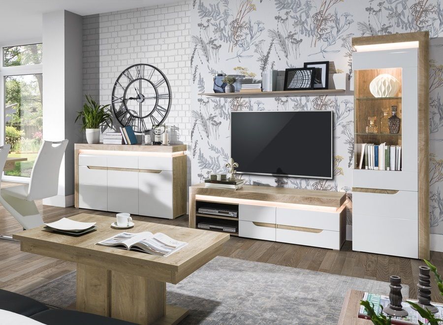Moderní, kvalitní a vzdušná obývací stěna se stane zajisté ozdobou Vašeho domu či bytu. Obývací stěna je praktická a poskytne Vám dostatečné množství úložného prostoru. Všechny komponenty mají systém tichého dovírání dvířek a v ceně je také působivé LED osvětlení u komody, televizného stolku a vitríny. Obývací stěna se skládá z komody, televizního stolku, velké police a vitríny. Obývací stěnu lze zakoupit jako komplet za zvýhodněnou cenu, nebo po jednotlivých dílech. K obývací stěně lze také zakoupit praktický rozkládací konferenční stolek.
