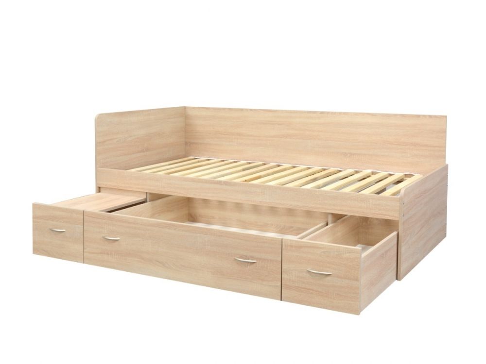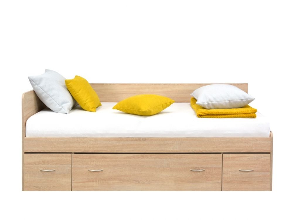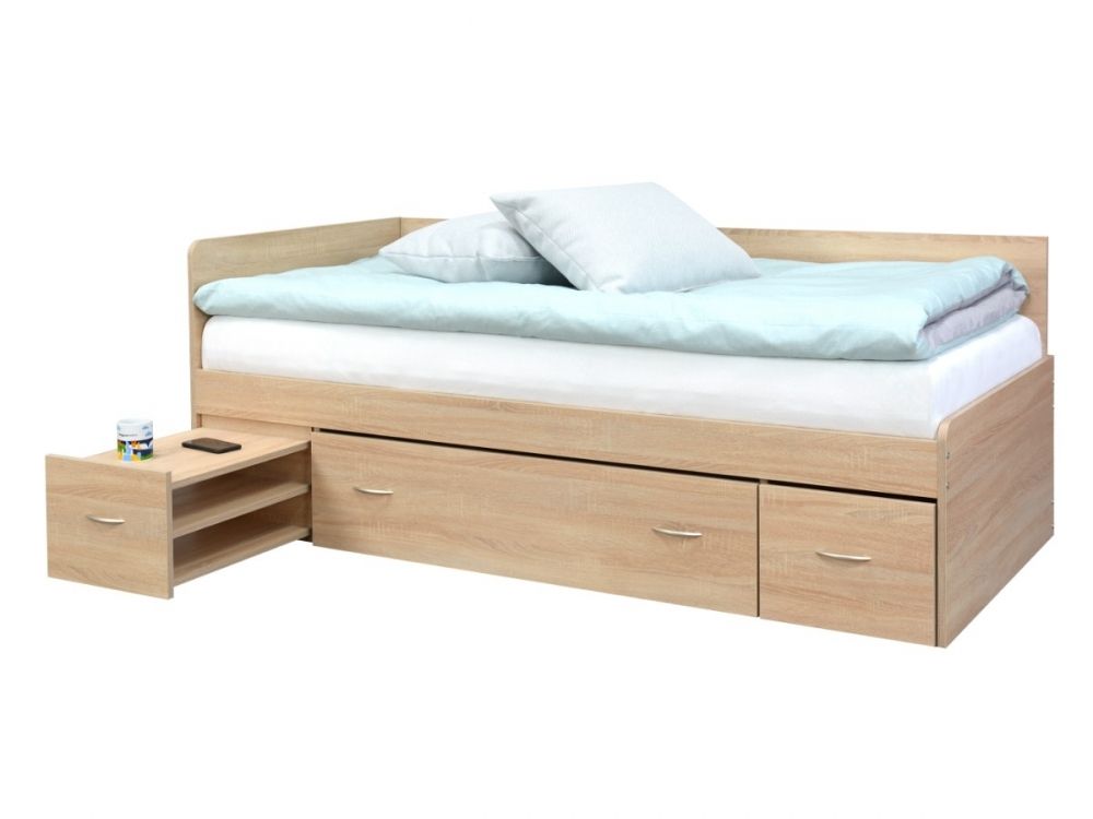 Moderní a praktická postel (válenda) Maximus je velmi oblíbená, protože splňuje naše požadavky na pohodlné spaní a úložný prostor.Tato postel má zabudovaný výsuvný noční stolek a 2 úložné prostory (vše na kolečkách). Součástí je také laťkový rošt. Bočnici na válendě Maximus můžete umístit jak vpravo, tak vlevo - je tedy univerzální. Levou nebo pravou variantu si zvolíte až při montáži. Cena postele je včetně roštu bez matrace, matraci 90x200cm můžete zakoupit v sekci matrace.