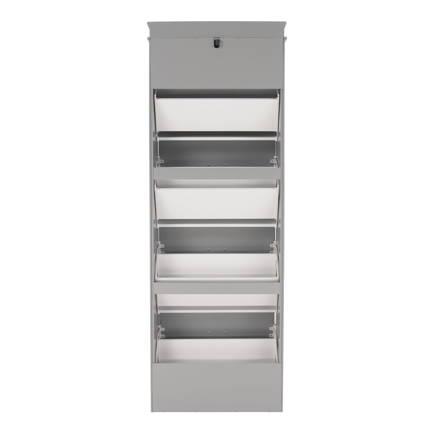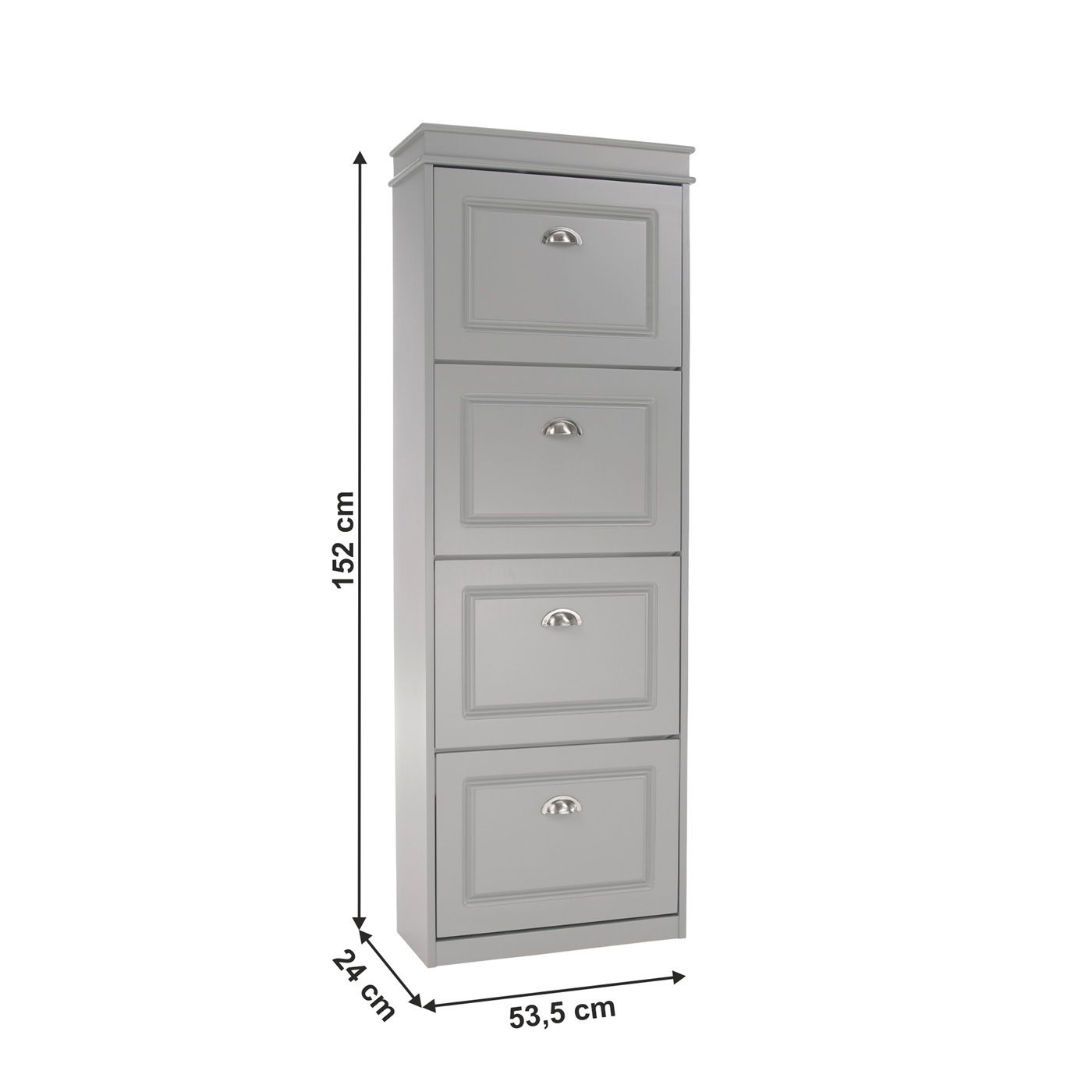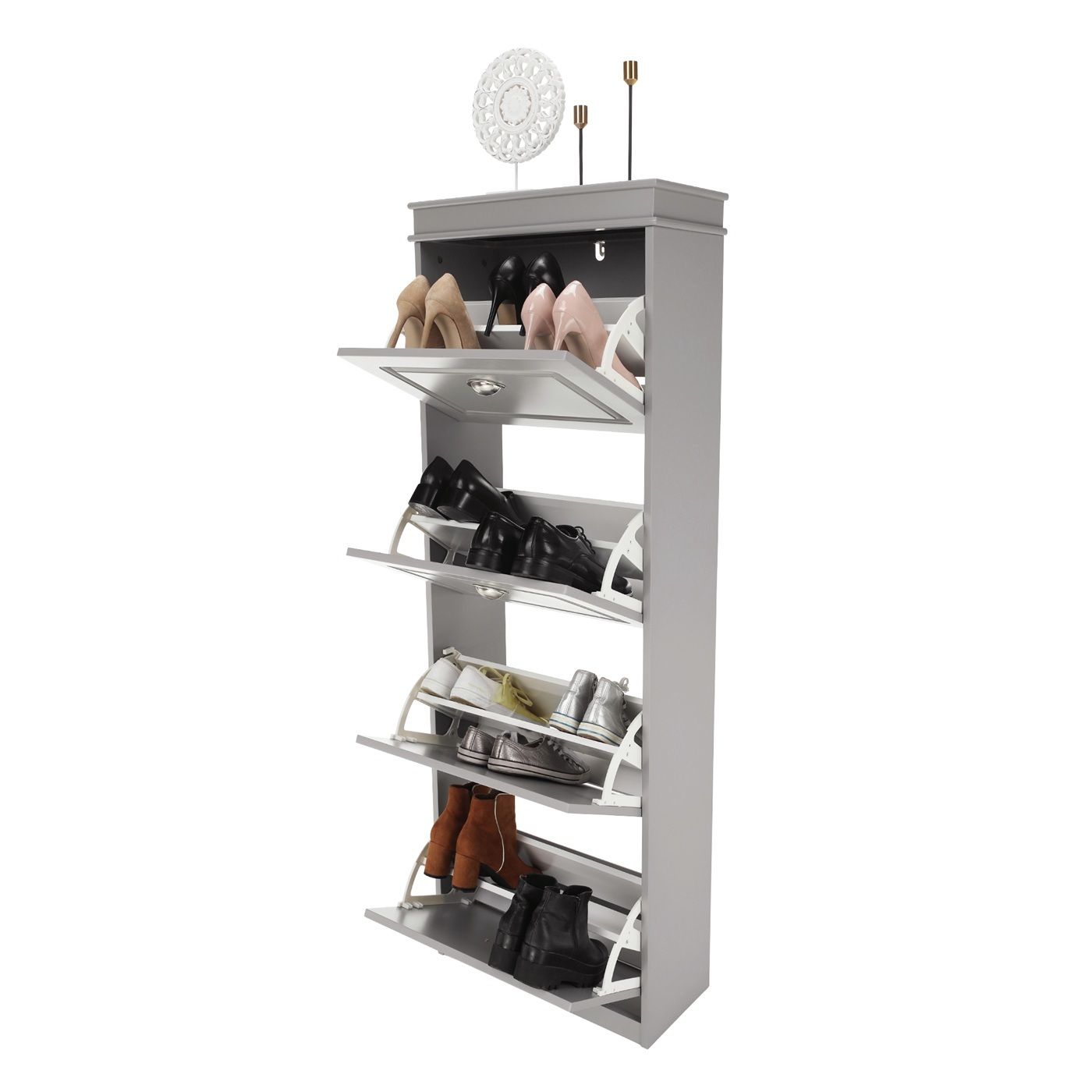 Moderní, praktický a kvalitní botník vyrobený s MDF + DTD. Botník je čtyř řadový se čtřmi výklopnými šuplíky vhodný na 16párů bot.