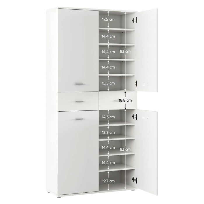Moderní, kvalitní a velmi praktický policový skříňový botník se šuplíky je vyrobený z DTD laminované 1,6cm.
