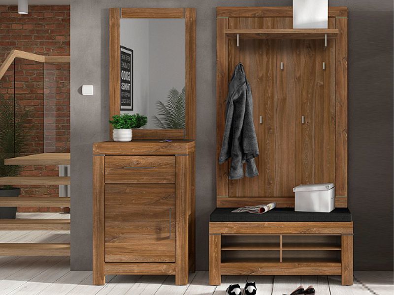 Moderní, designová a praktická předsíňová stěna ve venkovsém stylu. Předsíňová stěna se skládá z komody, zrcadla, botníku a věšákového panelu.