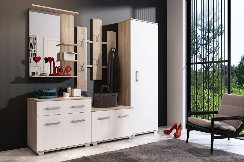 Moderní velká předsíňová stěna, která zaručuje velké množství úložného prostoru, je vyrobená z DTD laminované s ABS hranami. Skládá se ze skříňky se šuplíky, zrcadla, botníku, věšákové stěny a šatní skříně s jednou policí.