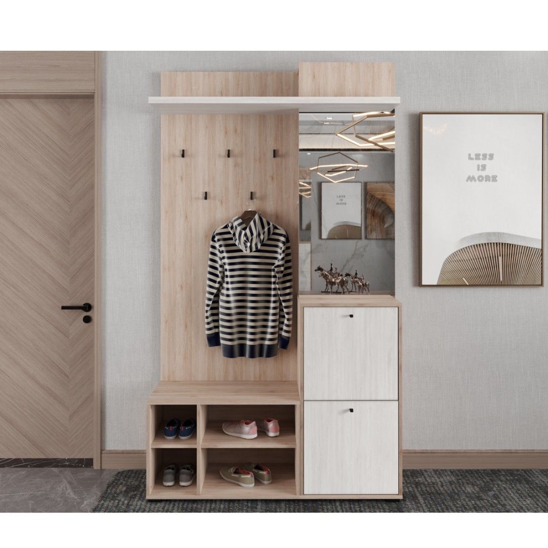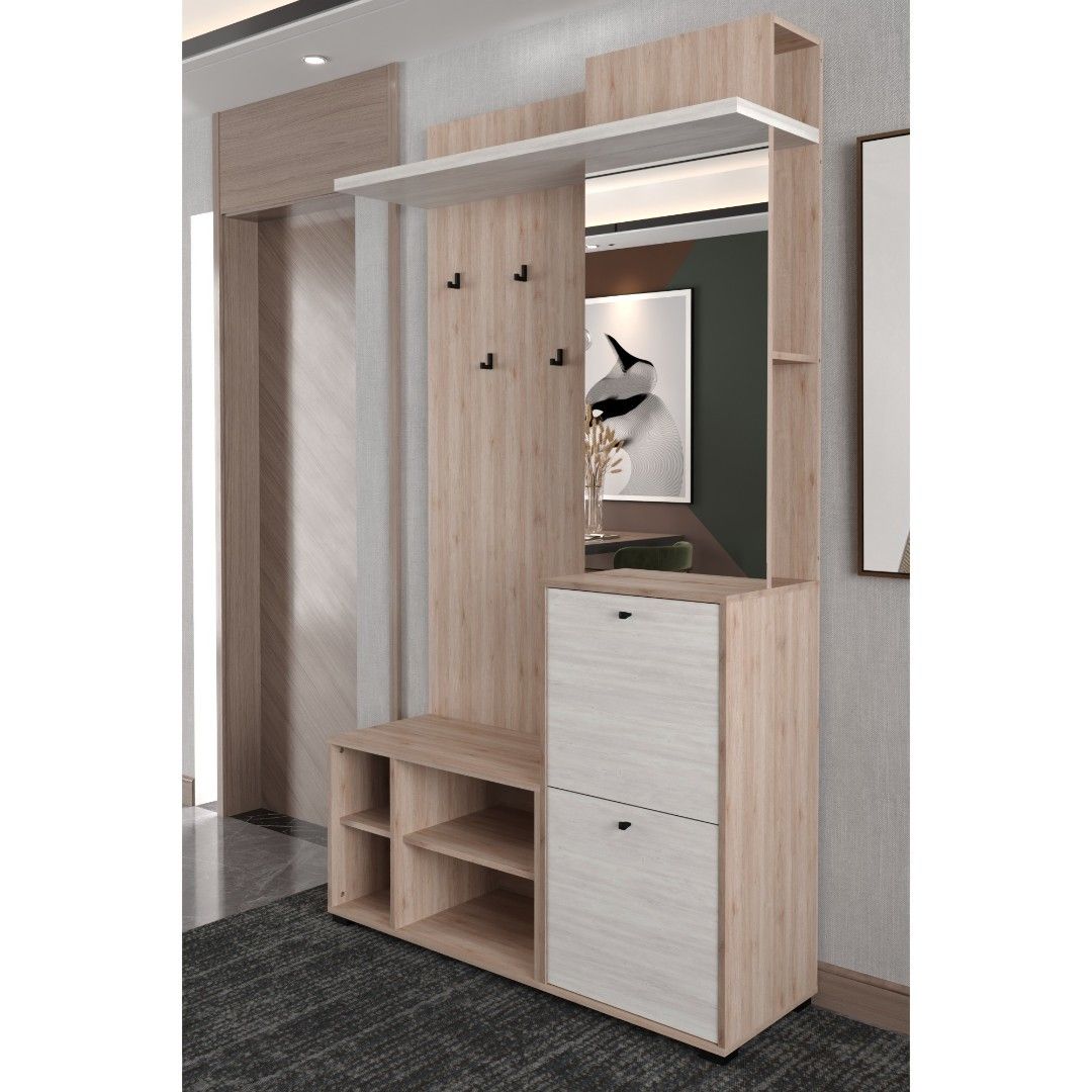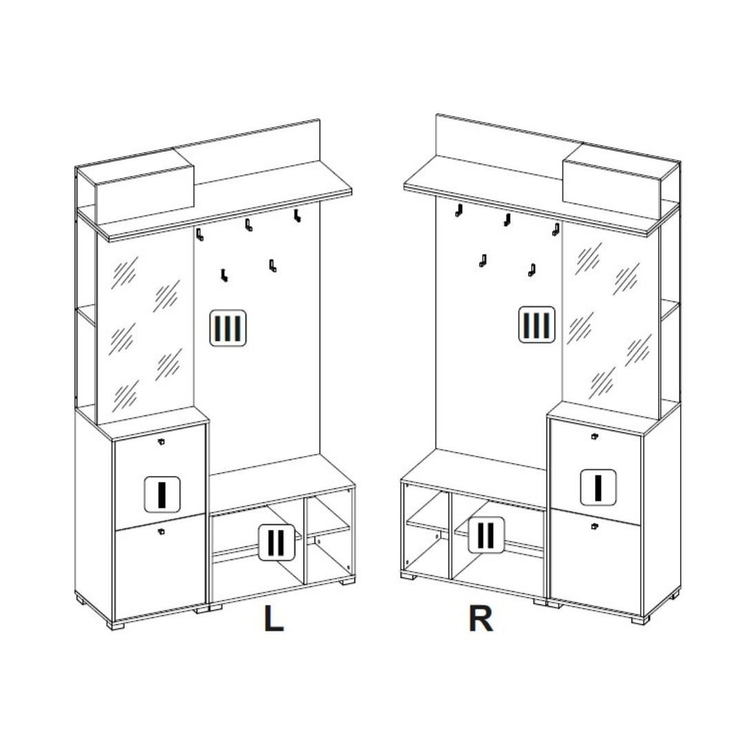 Moderní a velmi praktická předsíňová stěna Vám nabízí stylové místo pro uložení svrchního oděvu a obuvi, vždy budete mít každý kousek na svém místě, pěkně a přehledně uložený. Předsíňová stěna se skládá z otevřeného botníku, botníku s výklopnými dvířky, věšákového panelu, panelu se zrcadlem a bočními policemi a police. Předsíňová stěna je univerzální, můžete se složit pravou nebo levou variantu.