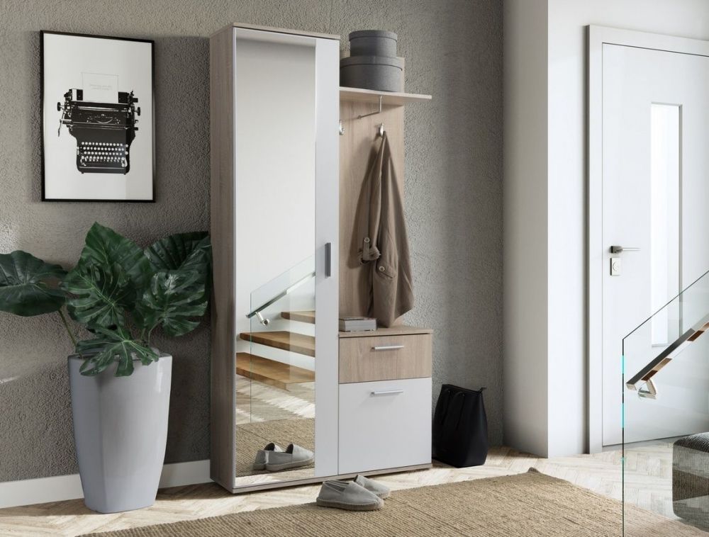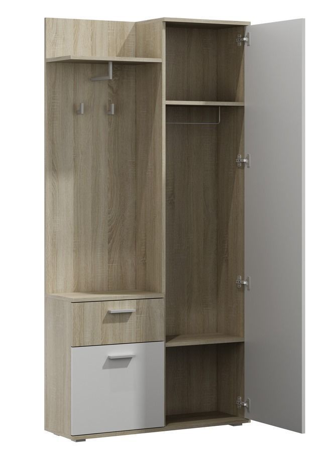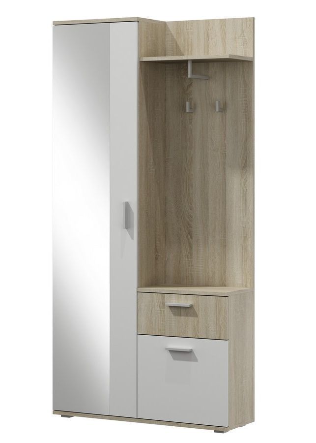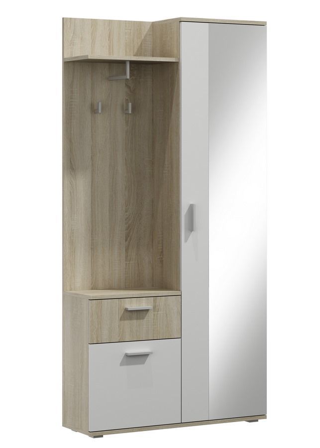 Moderní, kvalitní a praktická předsíňová stěna Vám poskytne množství tolik potřebného úložného prostoru, je univerzální můžete si sestavit pravou nebo levou variantu. Předsíňová stěna se skládá z věšákového panelu s policí, botníku se zásuvkou a šatní skříně se zrcadlem.
