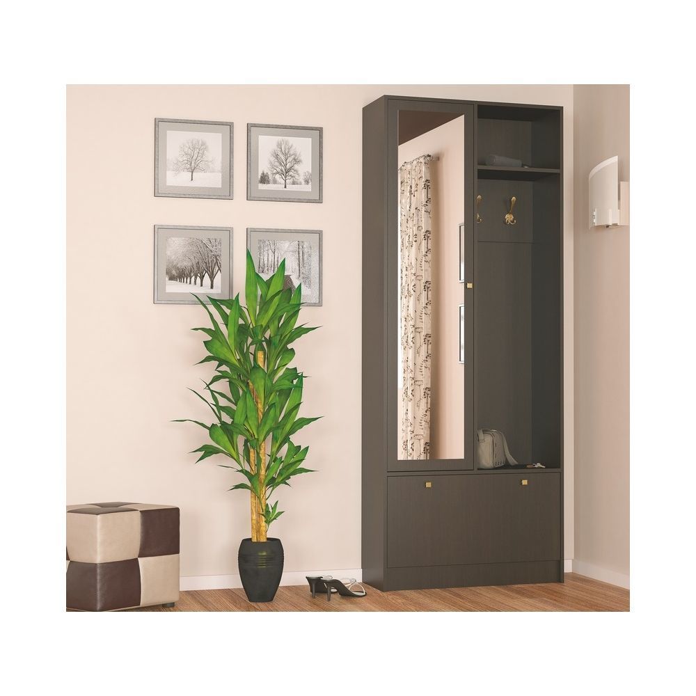 Praktická a moderní předsíňová stěna vhodná do menších prostorů. Stěna je vyrobena z kvalitní laminátové desky v barvě wenge tmavý. Součástí stěny jsou - skříňka na boty, vysoká skříň, dva věšáky na bundy, polička a na dveřích je zrcadlo. Dodáváme v demontovaném stavu.