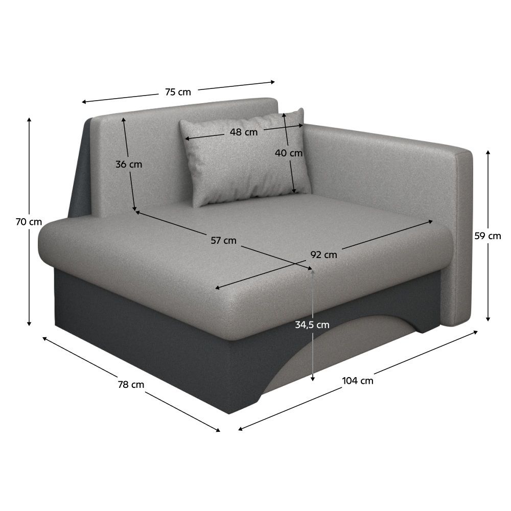 Rozměry: d:104 x h:78 x v:70cm, plocha na spaní 75 x 185cm, výška sedu je 34,5cm