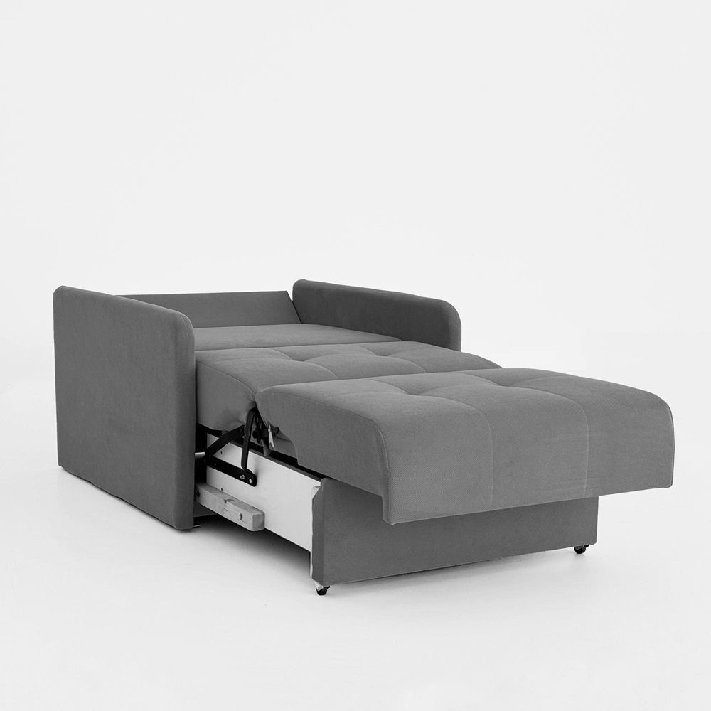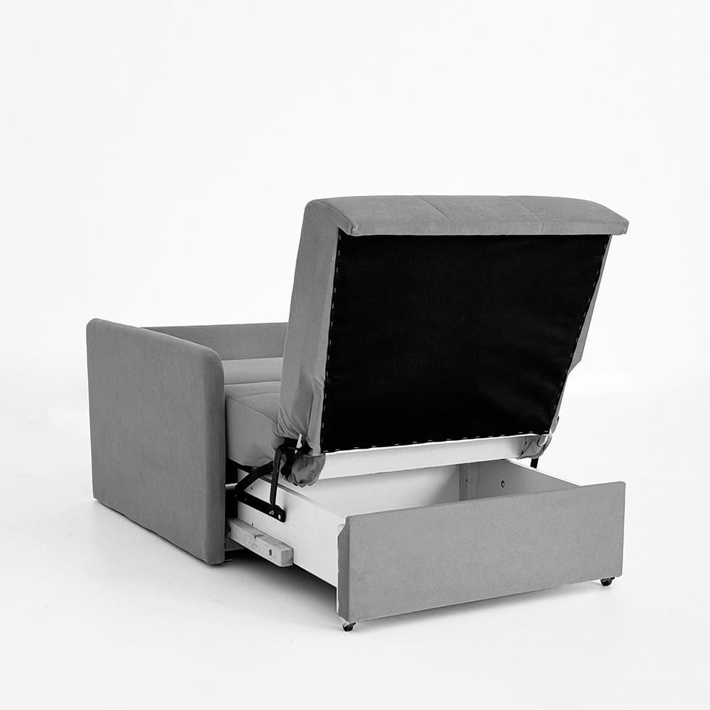 Moderní, kvalitní a pohodlné rozkládací křeslo s úložným prostorem. Jednoduchý a rychlý rozklad pomocí speciálního kování. Plocha na spaní je 190x78cm, výška sedu je 43cm a hloubka sedu je 57cm. Vyrábí se potah šedý.