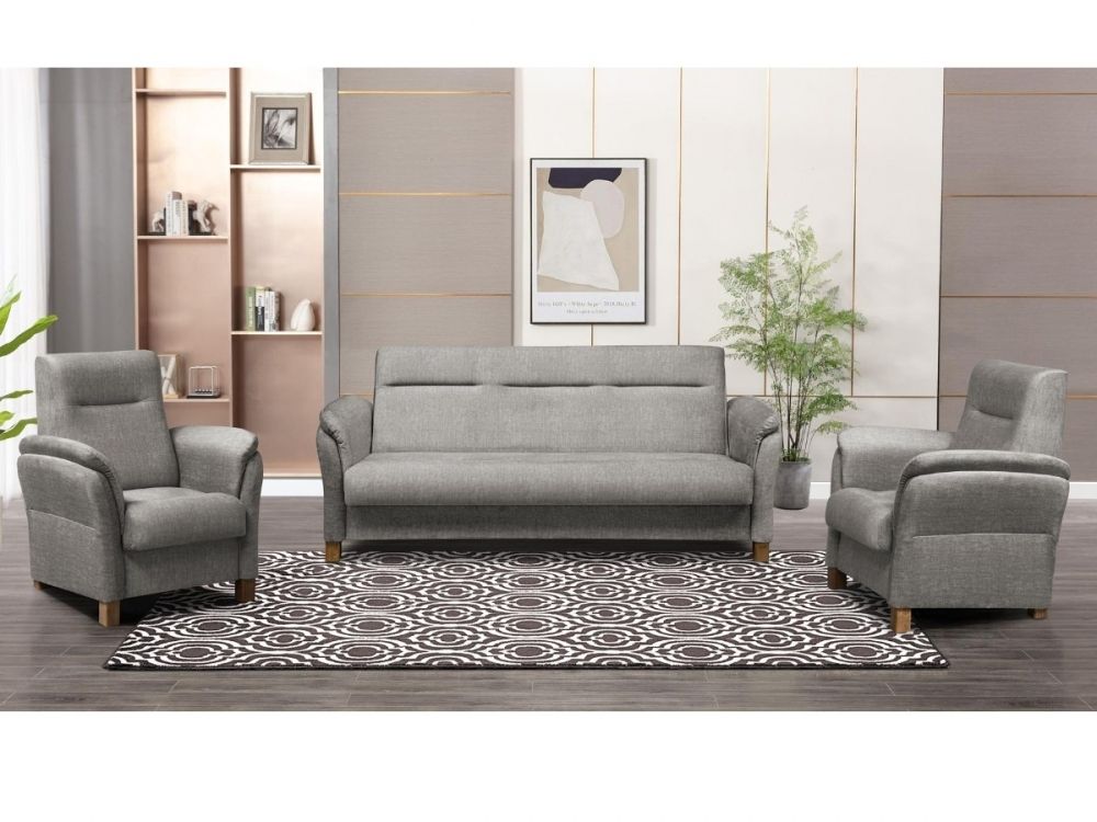 Moderní, kvalitní a praktická klasická sedací souprava, se skládá z trojopohvky rozkládací (clic clac) s úložným prostorem a dvou pohodlných křesel