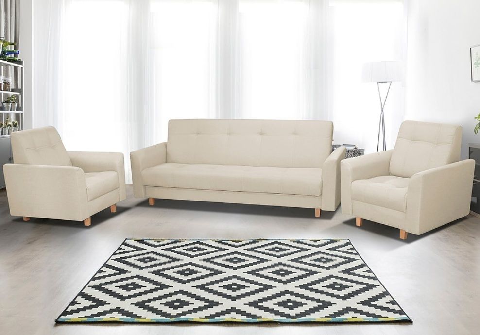 Tato sedací souprava potěší milovníky retro designu. Pohovka je rozkládací a samozřejmostí je i praktický úložný prostor. Plocha na spaní 190x120cm. Retro styl podtrhují dřevěné nožky a prošití s vtahy. Je potažena příjemnou kvalitní látkou v šedobéžovém odstínu (barvu nejlépe vystihuje poslední menší obrázek). Výplň sedáku tvoří kombinace pružin bonell s kvalitní PUR pěnou. Jednoduchým rozložením pomocí systému klik-klak vznikne lůžko k občasnému přespání. Vyobrazené dekorace nejsou v ceně.