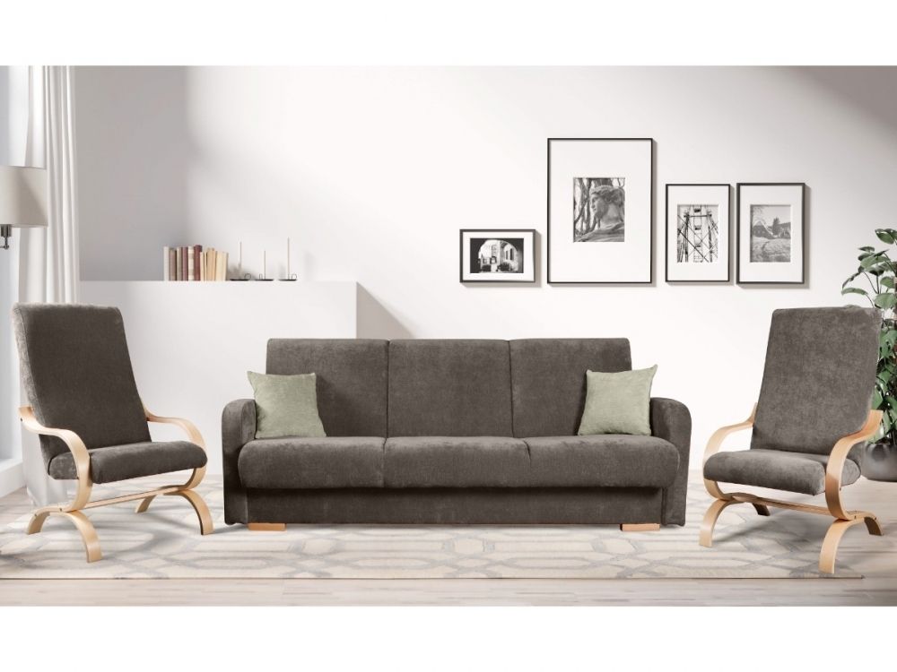 Moderní, pohodlná a praktická sedací souprava se skládá z rozkládací pohovky s úložným prostorem a dvou pohodlných pohupovacích křesel.