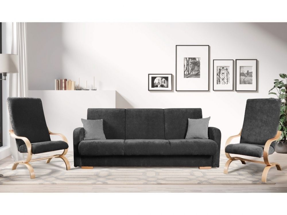 Moderní, pohodlná a praktická sedací souprava se skládá z rozkládací pohovky s úložným prostorem a dvou pohodlných pohupovacích křesel.
