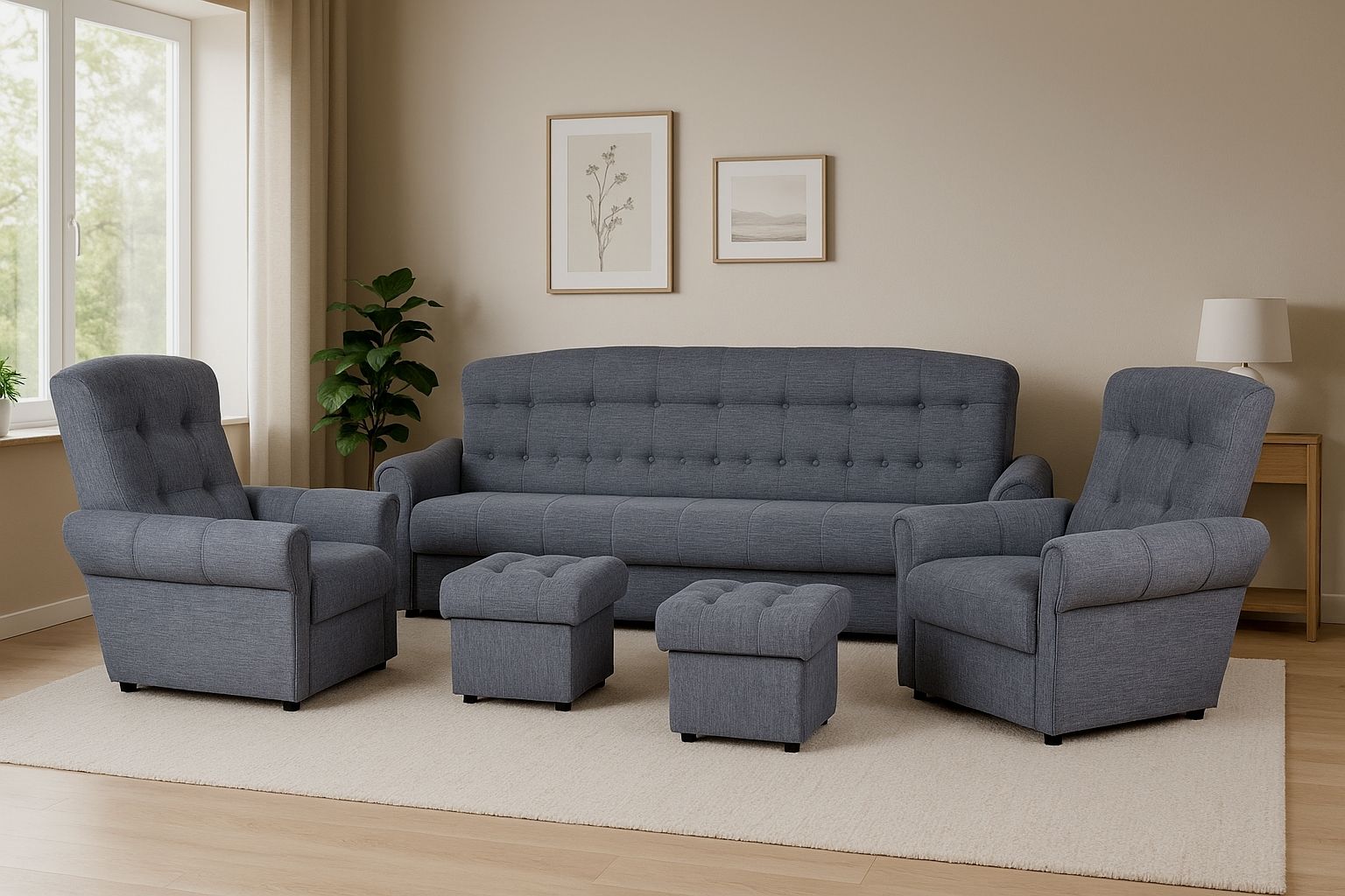 Moderní a praktická klasická sedací souprava v šedé barvě je velice oblíbená. Je rozkládací a součástí je praktický úložný prostor. Svou kombinací trojsedu, dvou křesel a dvou taburetů je vhodná i pro vícečlennou rodinu. Trojsed lze jednoduše rozložit stylem klik/klak a tím poslouží k občasnému přespání. Po rozložení vznikne plocha pro spaní 188 cm x 120 cm. Sedáky jsou z PUR pěny, která zajistí pohodlné sezení a vyšší opěrky ocení především starší lidé. Taburety mají také úložný prostor.