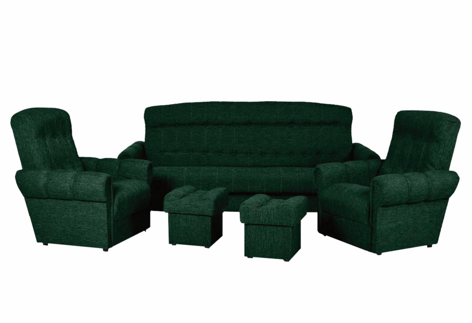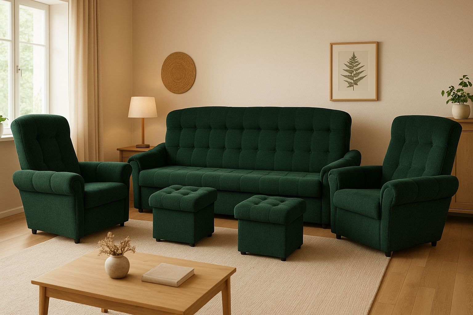 Moderní a praktická klasická sedací souprava v zelené barvě je velice oblíbená. Je rozkládací a součástí je praktický úložný prostor. Svou kombinací trojsedu, dvou křesel a dvou taburetů je vhodná i pro vícečlennou rodinu. Trojsed lze jednoduše rozložit stylem klik/klak a tím poslouží k občasnému přespání. Po rozložení vznikne plocha pro spaní 188 cm x 120 cm. Sedáky jsou z PUR pěny, která zajistí pohodlné sezení a vyšší opěrky ocení především starší lidé. Taburety mají také úložný prostor.