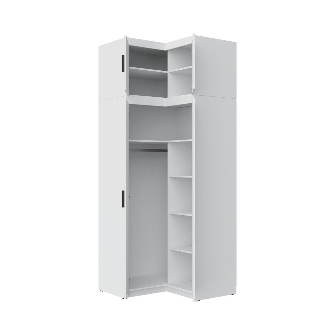 Moderní a velmi praktická rohová skříň Vám poskytne množtsví úložného prostoru. Vnitřní vybavení skříně tvoří police a šatní tyč. Snadné otevírání dveří zajistí dlouhé úchytky z tvrzeného plastu, které skvěle sedí k čistému designu skříně.