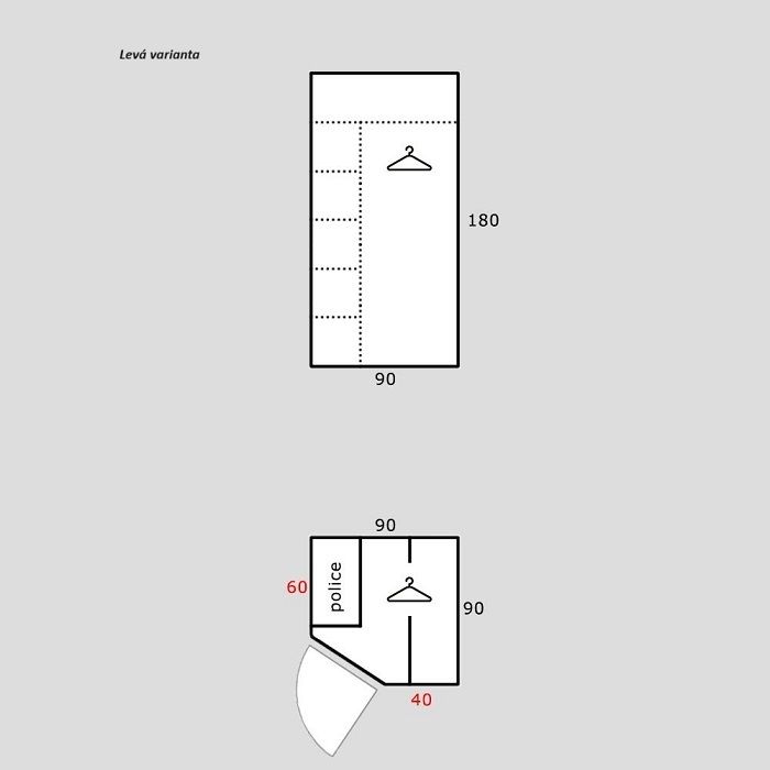Moderní a praktická rohová kombinovaná skříň, část je policová a část je věšáková. Materiál: strop - laminovaná DTD 25mm + ABS 2mm, ostatní DTD tl. 16mm + ABS 0,5 mm. Dveře jsou z DTD 16mm + ABS 1mm. Stříbrné plastové nožičky výšky 2cm, kovová úchytka, levé provedení.