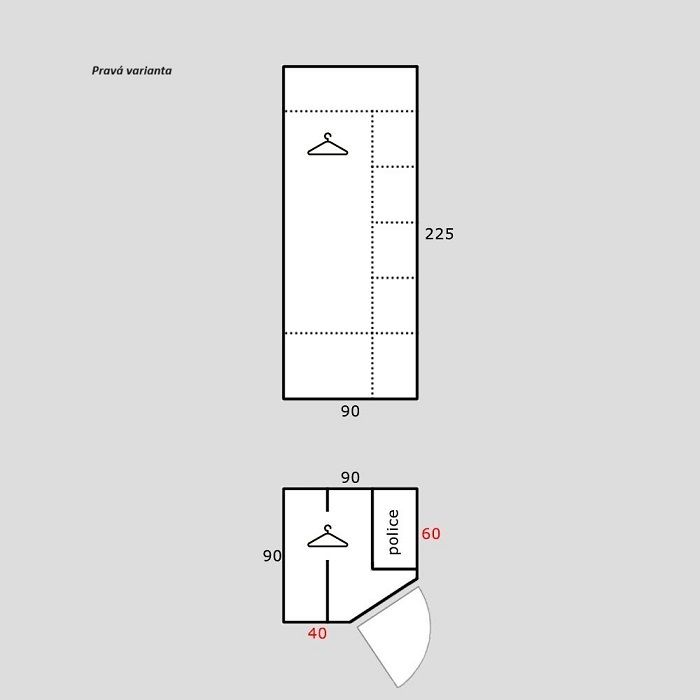 Moderní a praktická rohová kombinovaná skříň, část je policová a část je věšáková. Materiál: strop - laminovaná DTD 25mm + ABS 2mm, ostatní DTD tl. 16mm + ABS 0,5 mm. Dveře jsou z DTD 16mm + ABS 1mm. Stříbrné plastové nožičky výšky 2cm, kovová úchytka, pravé provedení.