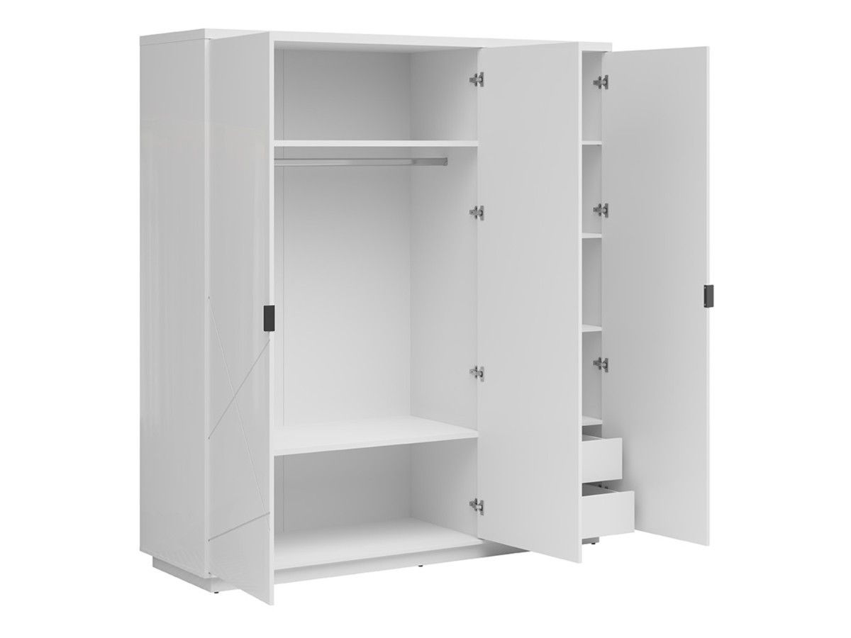Moderní, kvalitní, elegantní a velmi praktická kombinovaná skříň dvě třetiny jsou šatní a jedna třetina je policová Vám poskytne velké množství úložného prostoru. Dvířka jsou z MDF potaženy PVC fólií a mající stylové frézované vzory. Její úložný prostor je v podobě šatní tyče, policové části a části se zásuvkami. Šatní tyč má délku 116 cm, vnitřní rozměr šuplíků je 49 x 14 x 45 cm.