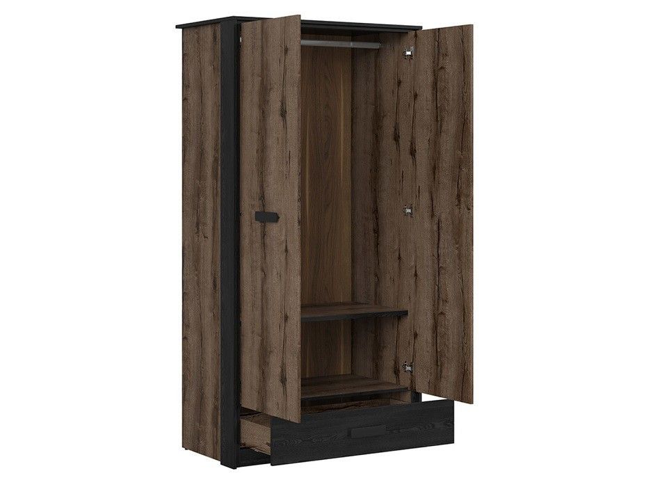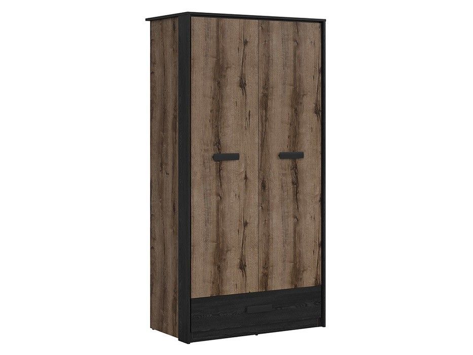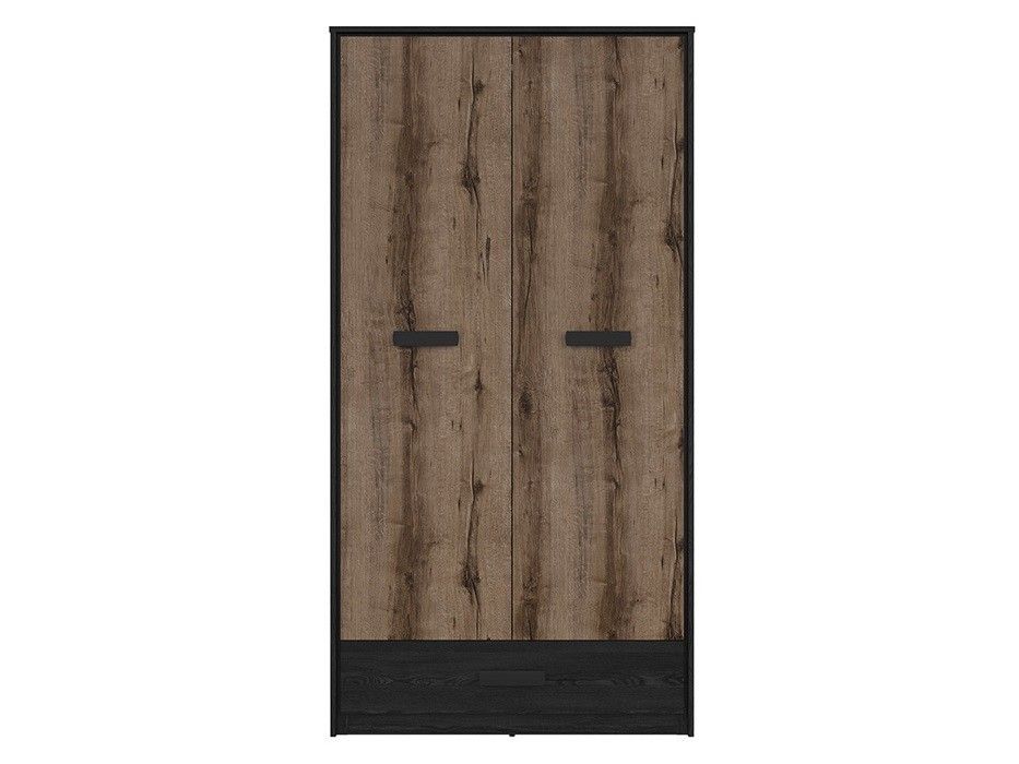 Moderní a praktická dvoudvéřová šatní skříň k dispozici Vám bude jedna šatní tyč, police a prostorná zásuvka ve spodní části skříně. Jednoduchý design vsází zejména na kombinaci teplých barev a dekor s výraznou kresbou dřeva. Lamino zvolené na výrobu skříně je v odstínech Dub monastery a Dub černý.